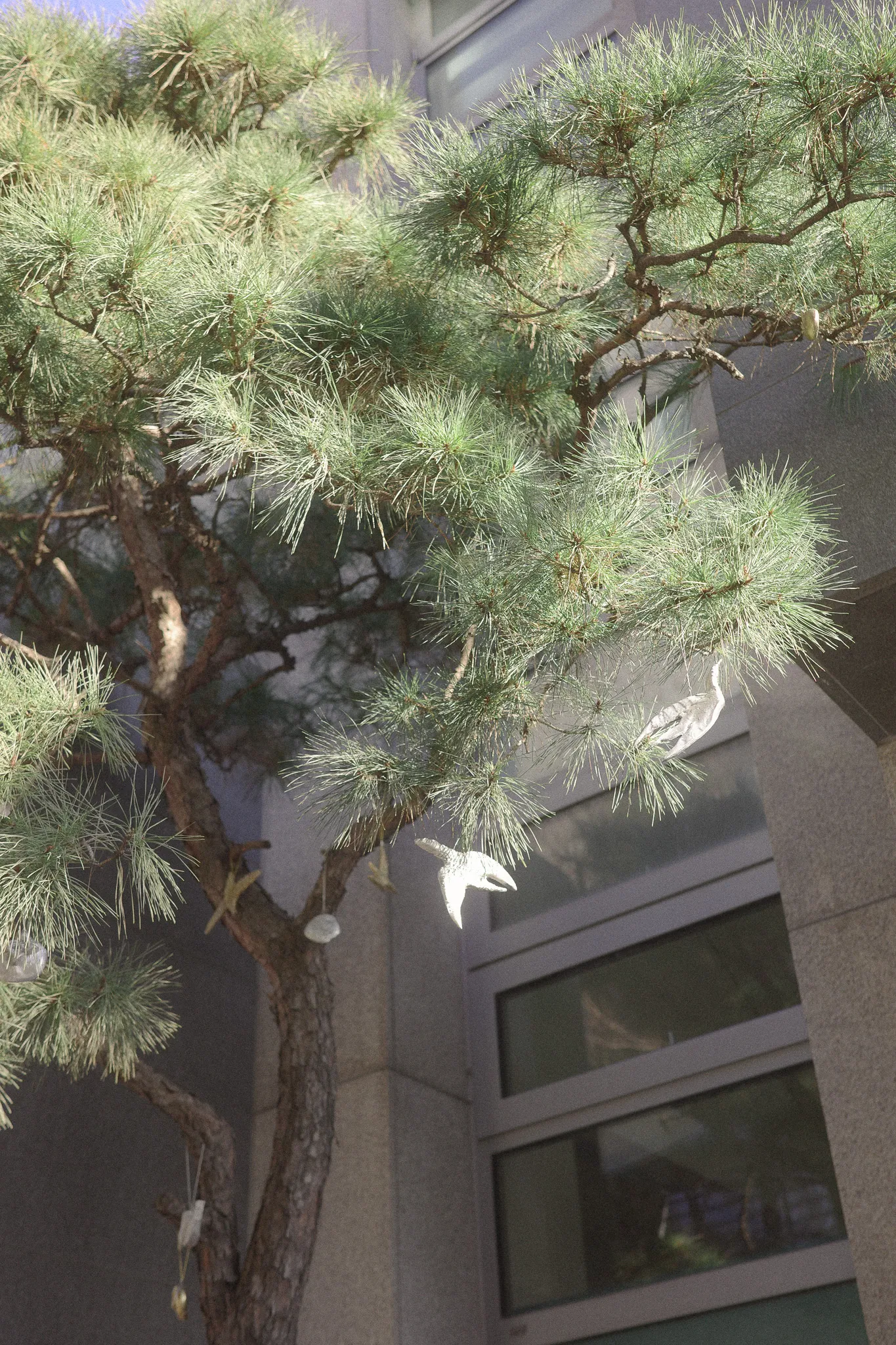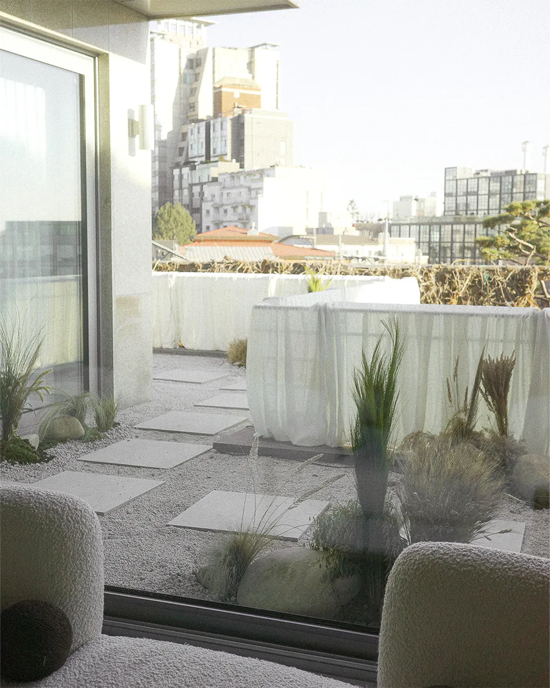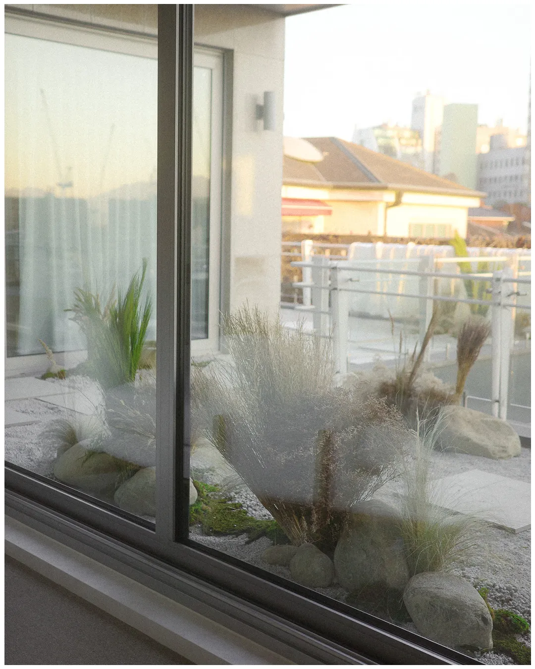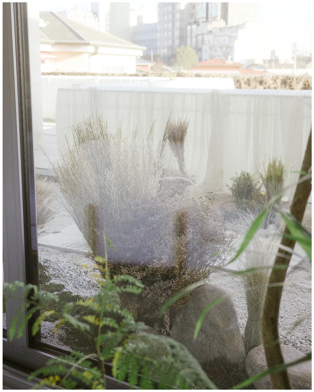 풍요의 소산인 감과 행운을 물어오는 제비를 담은 오너먼트는 주택 입구 소나무에 걸려 시그널 하우스로 들어오는 이를 기쁘게 맞이한다. 원래 그 자리에 있었던 것 처럼 자연스러운 양감의 호박돌과 그늘진 담벼락에 핀 듯한 순순한 사탕수수, 야생귀리, 밀과 갈대는 회백색의 색조 아래 어우러진다. 또, 넓직한 앞마당으로 빌려온 남산 일대의 차경을 은은한 마 직물로 투영되도록 주름을 겹쳐 연출했다.